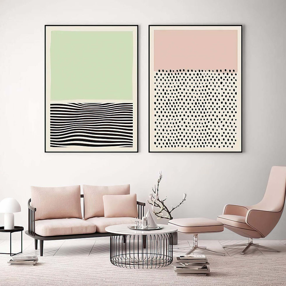 Os quadros decorativos abstratos também podem ser usados para reforçar uma estética mais minimalista, combinando com a paleta de cores já existente no ambiente.